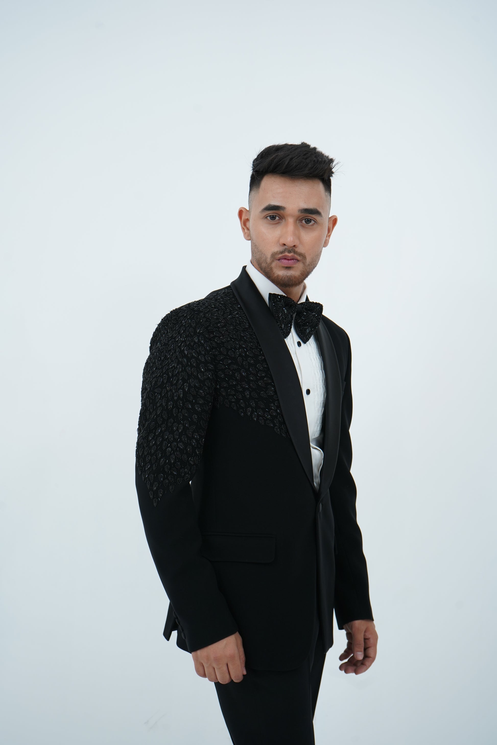 Elevate your formal wear with our Zardozi Zari Japanese Black Tuxedo. Expertly crafted, this tuxedo features intricate zardozi work adorned with an elegant leaves pattern. Perfect for any distinguished occasion, this ensemble blends traditional craftsmanship with contemporary sophistication. Make a lasting impression with Zardozi Zari.