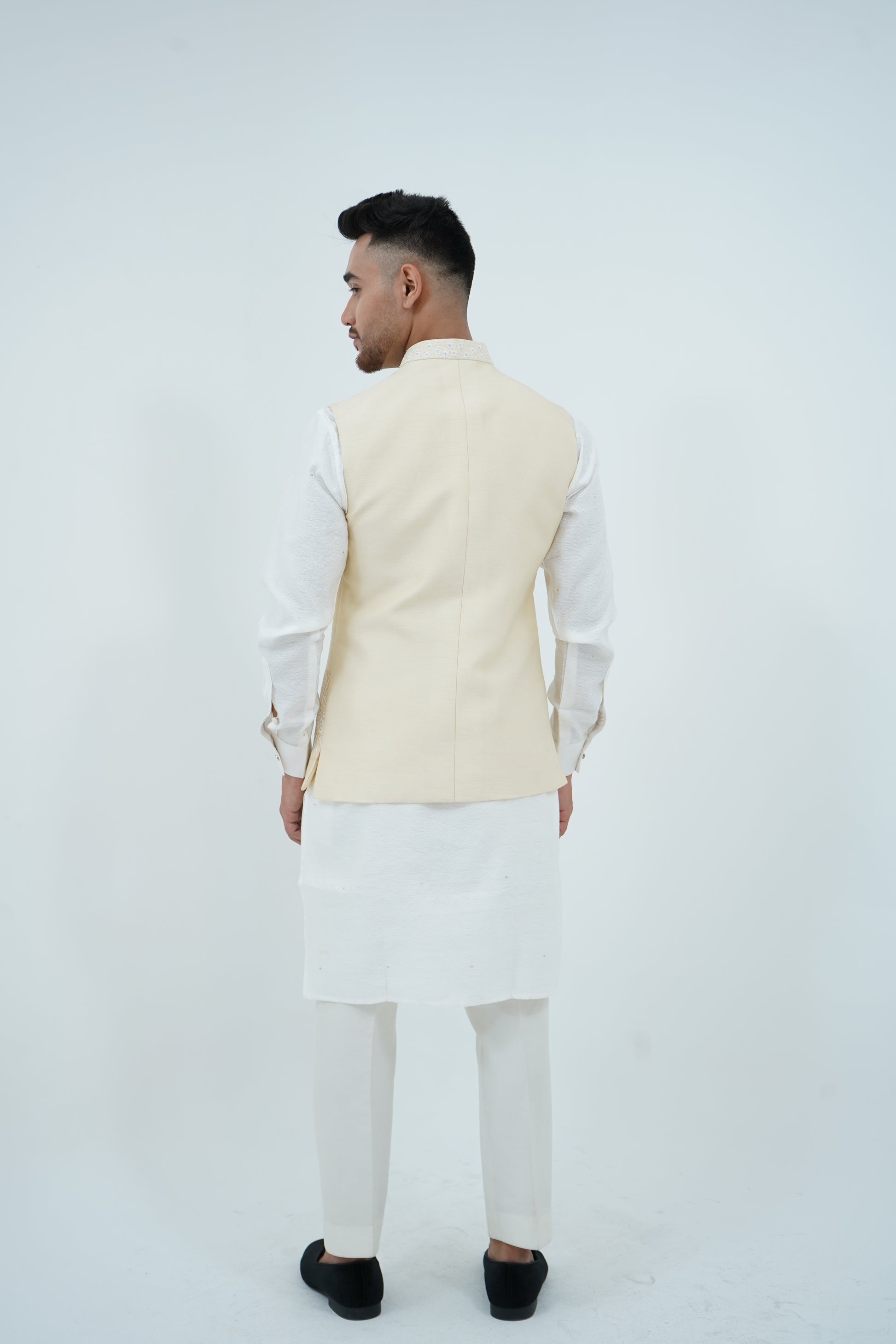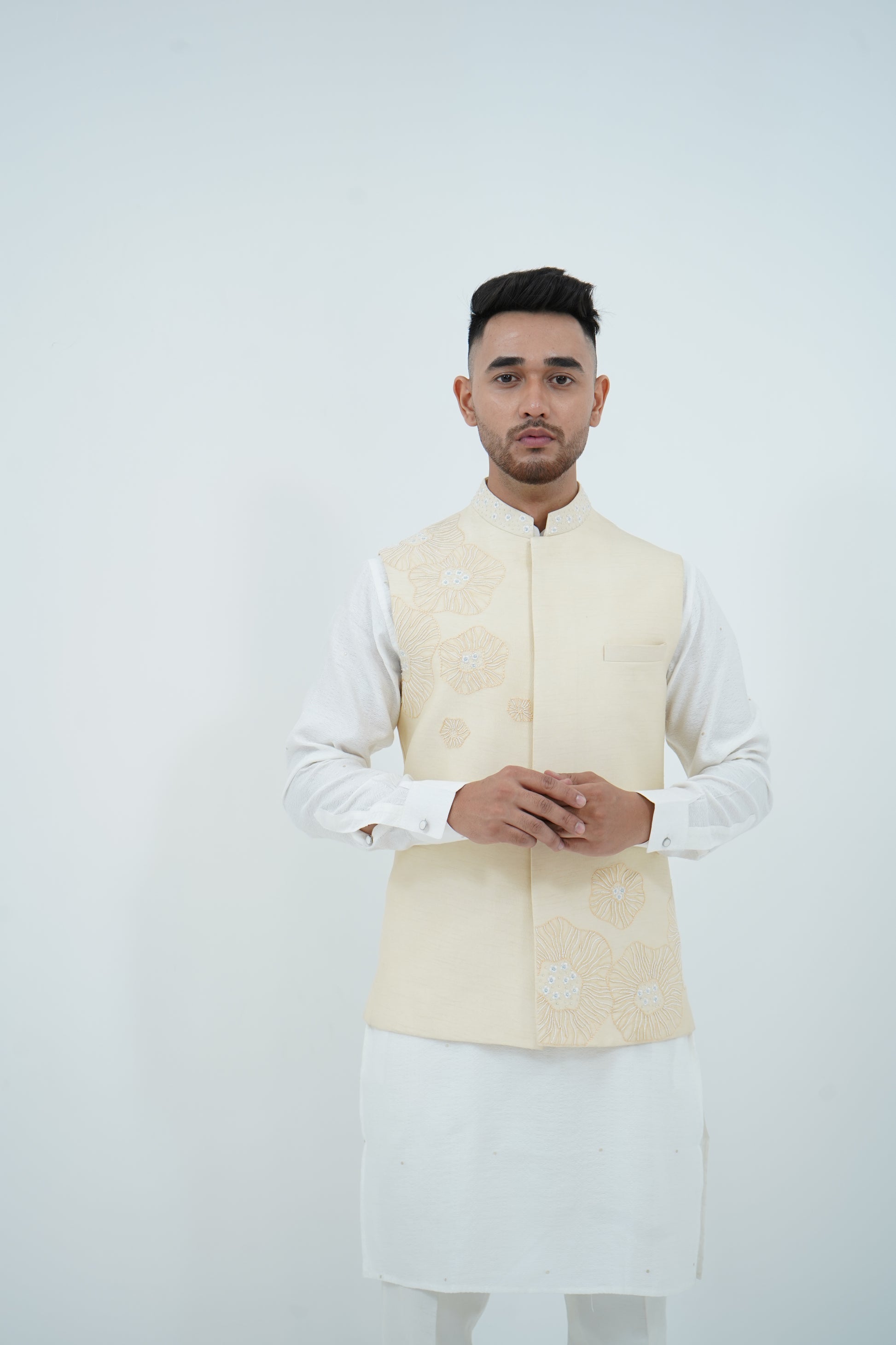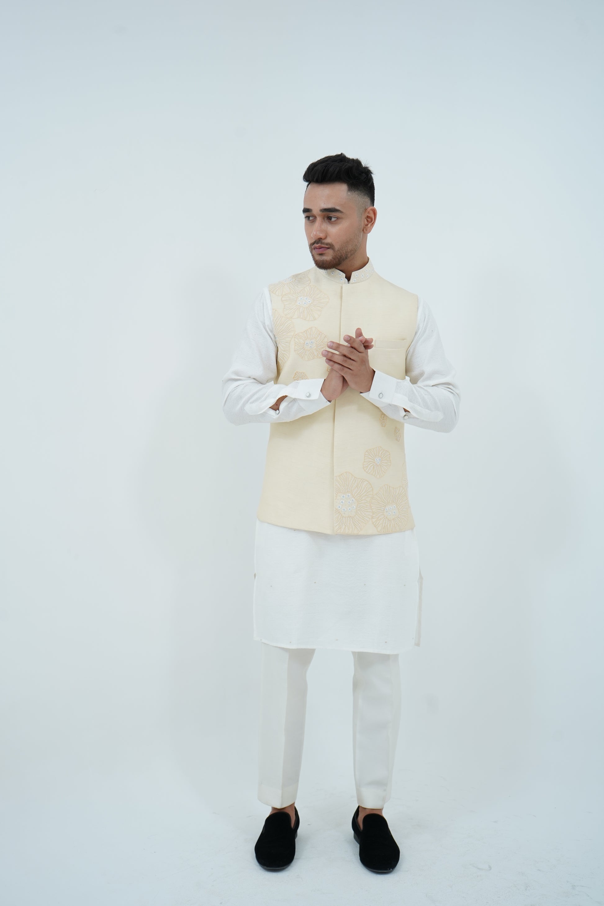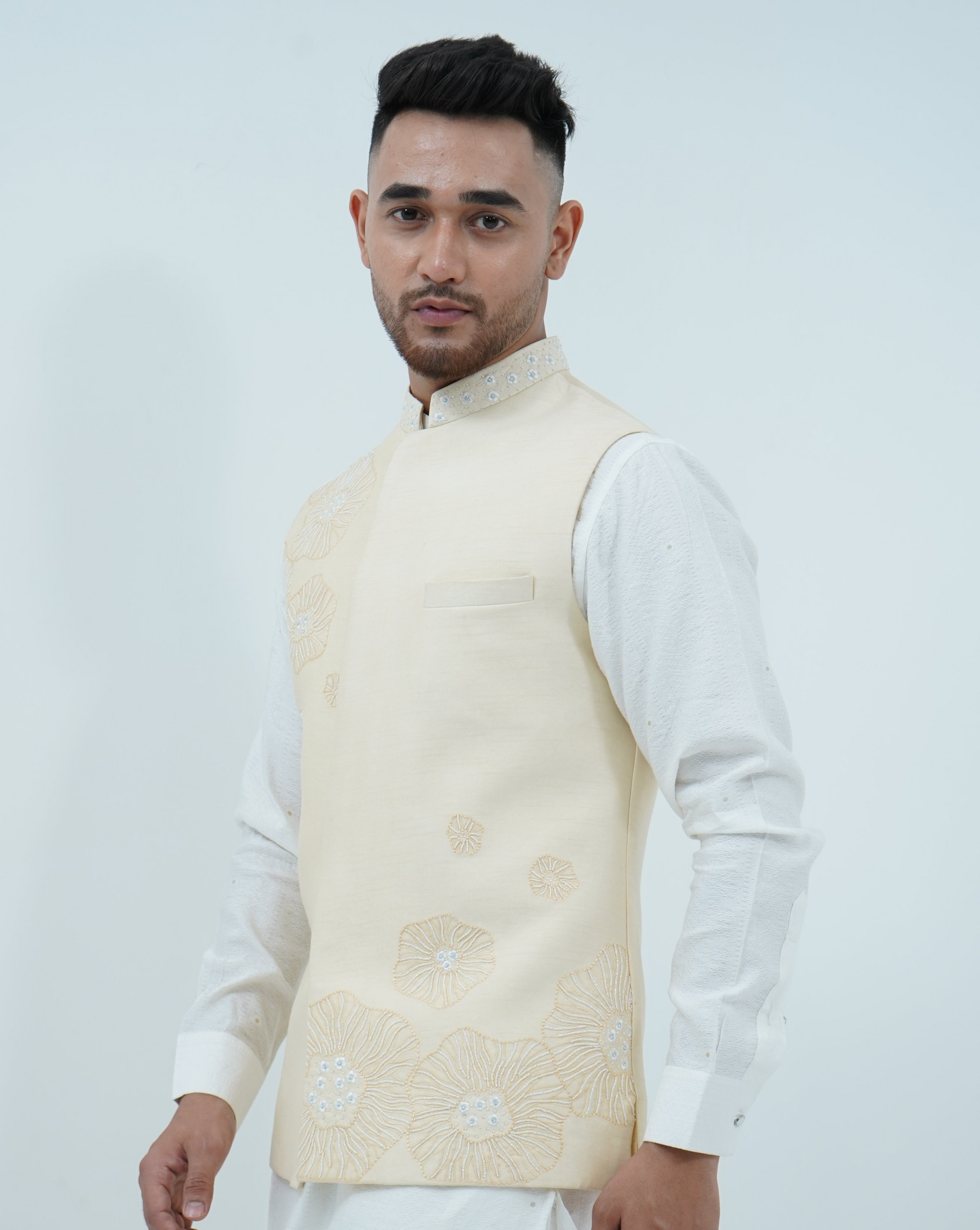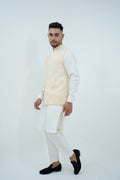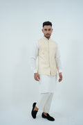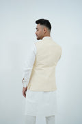 A beige Bundi Jacket paired with Ivory Kurta and Pajama