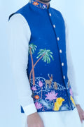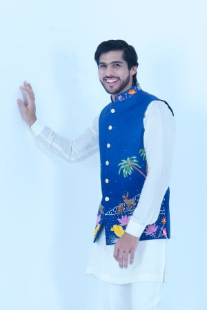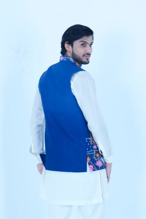 A Embroidered Blue Bundi Jacket Paired with Ivory Kurta Pajama