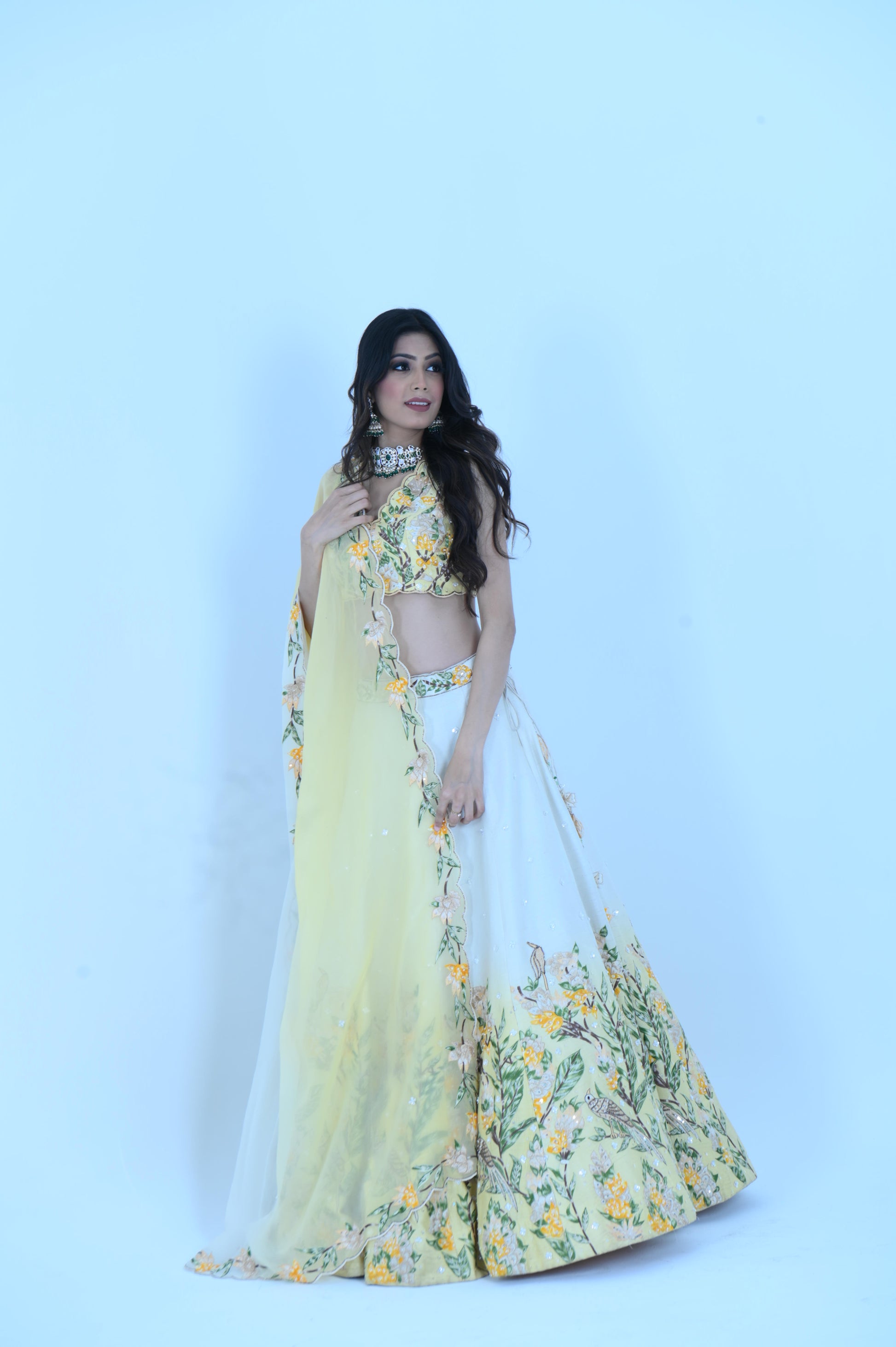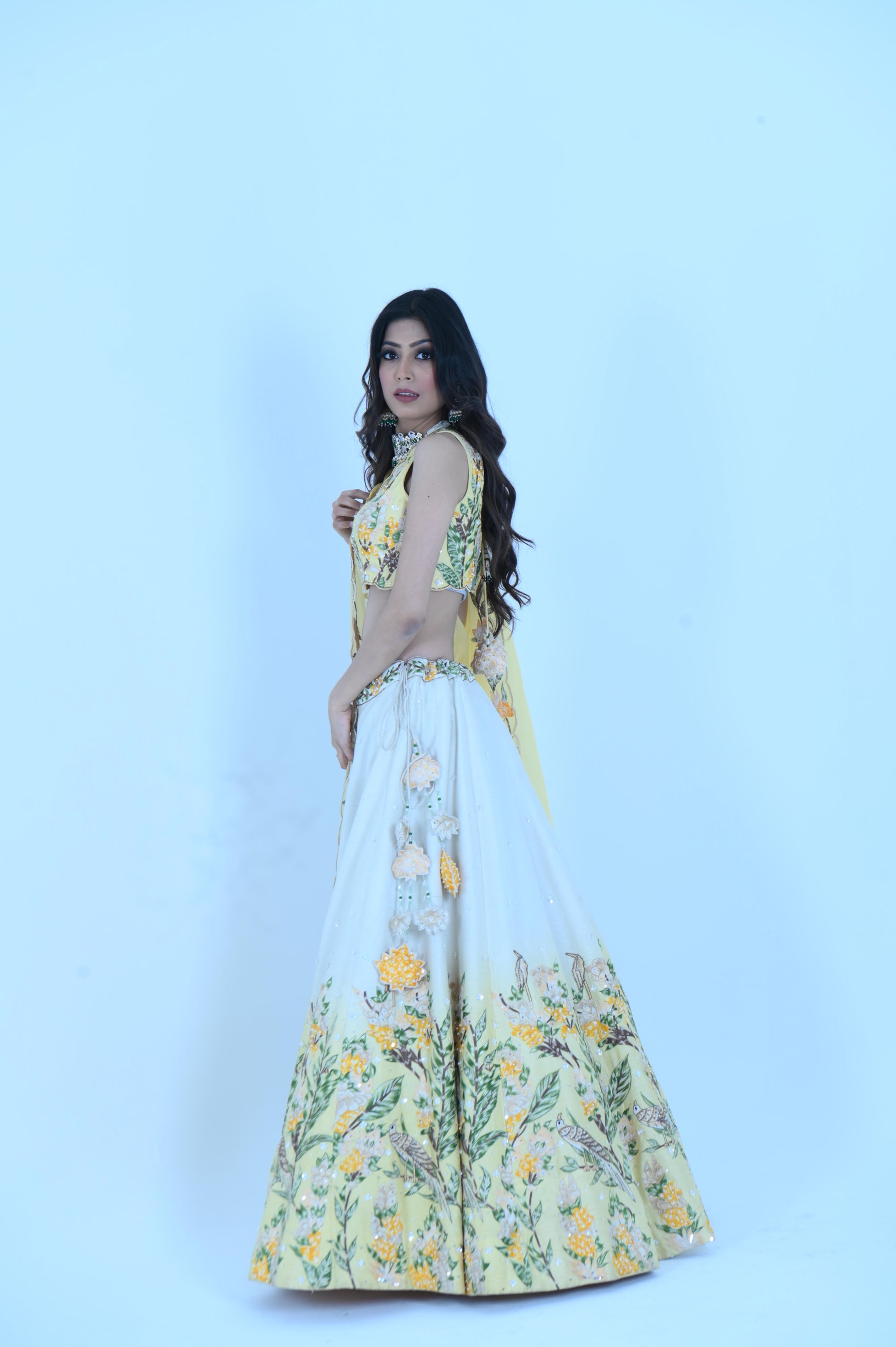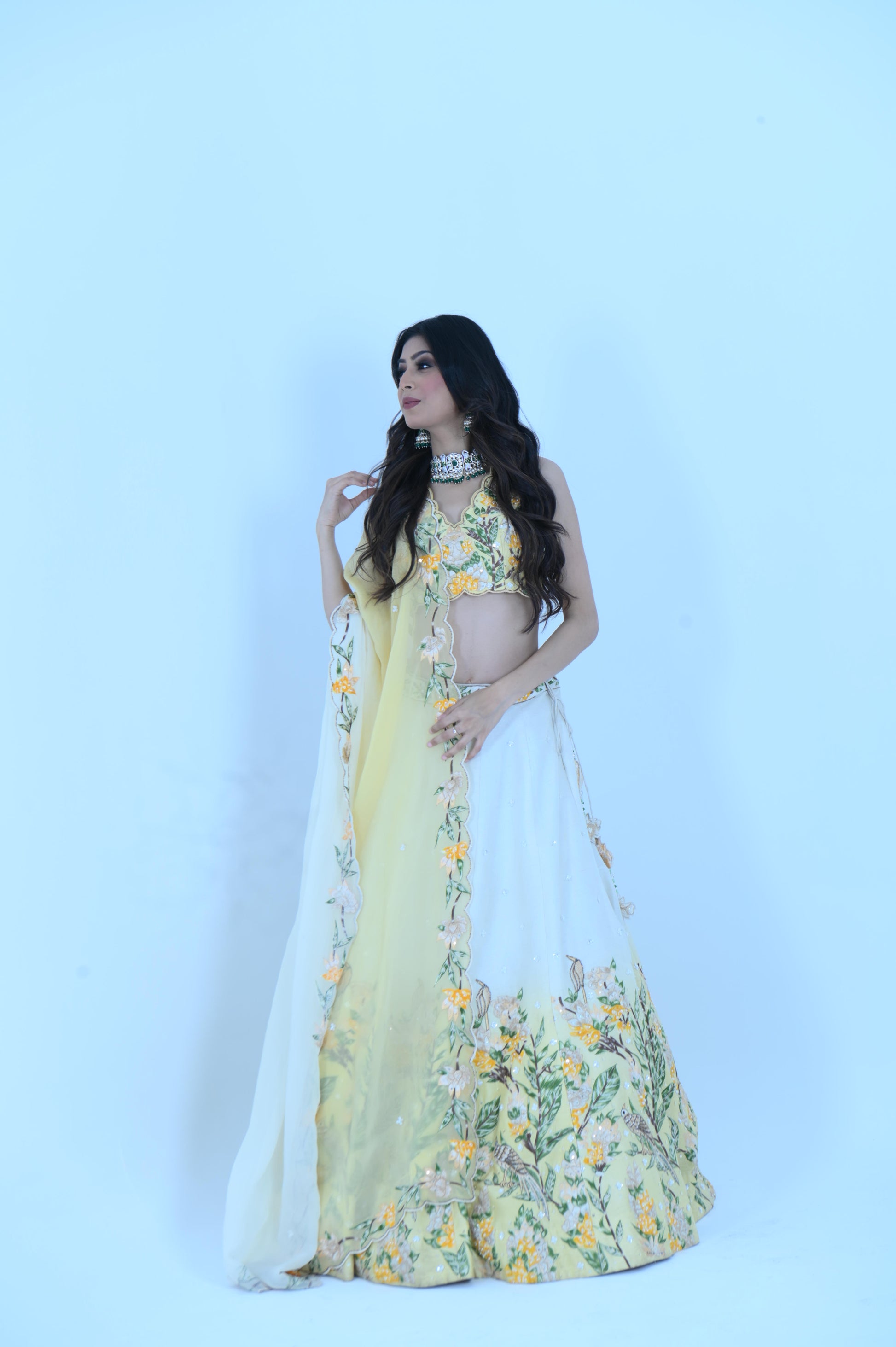 Brighten your look with our Zardozi Zari Raw Silk Lemon Ombre Lehenga. This exquisite piece features a refreshing lemon ombre design on luxurious raw silk, adorned with intricate zardozi embroidery. Complemented by a delicate organza dupatta with elegant zari accents, this ensemble is perfect for any festive occasion.